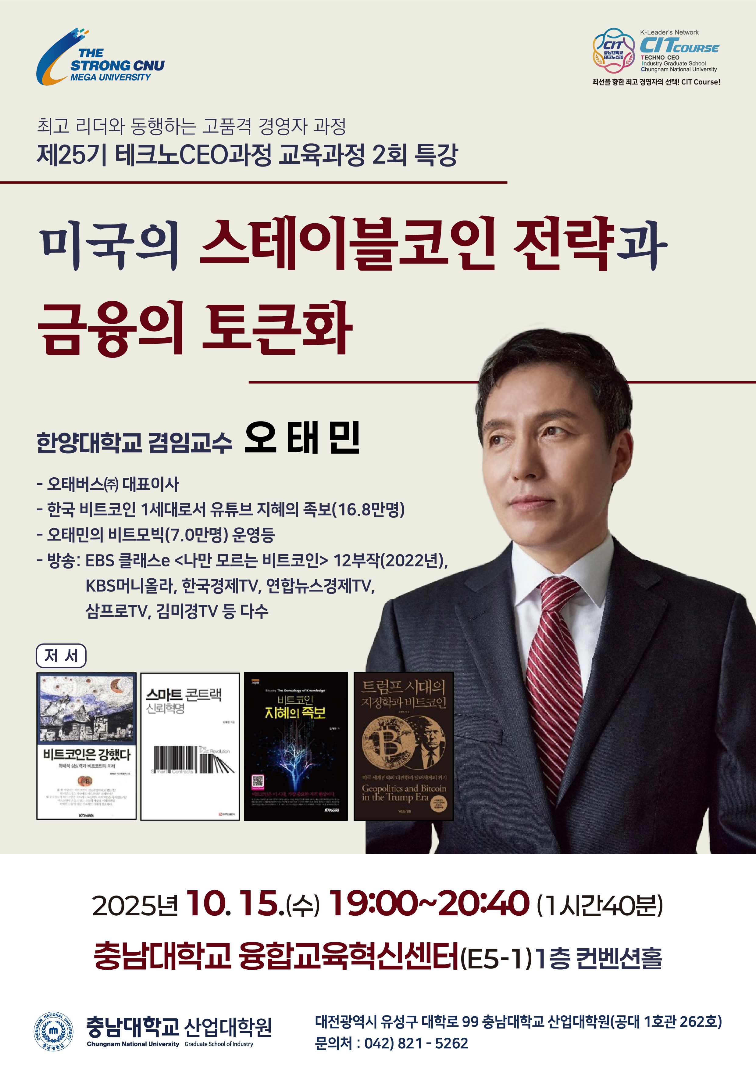 산업대학원 테크노CEO과정 제25기 교육과정의 일환으로, 디지털 자산과 금융의 미래를 주제로 초청 특강을 아래와 같이 개최하오니 학내 관심있는 교직원 및 학생 여러분의 많은 참여 바랍니다. 가. 주 제: 미국의 스테이블코인 전략과 금융의 토큰화 (비트코인의 지정학적 의미 포함) 나. 강연자: 오태민 작가 ( 現 한양대학교 비트고인 화폐철학 대학원 겸임교수/오태버스(주) 대표이사) 다. 일 시: 2025년 10월 15일(수) 오후 7시 ~ 8시 40분(100분) 라. 장 소: 충남대학교 융합교육혁신센터(E5-1) 1층 컨벤션홀 마. 대 상: 관심있는 학내 모든 구성원 바. 문의처: 충남대학교 산업대학원 (☎ 042-821-5262) 붙임 홍보 포스터 1부. 끝. |